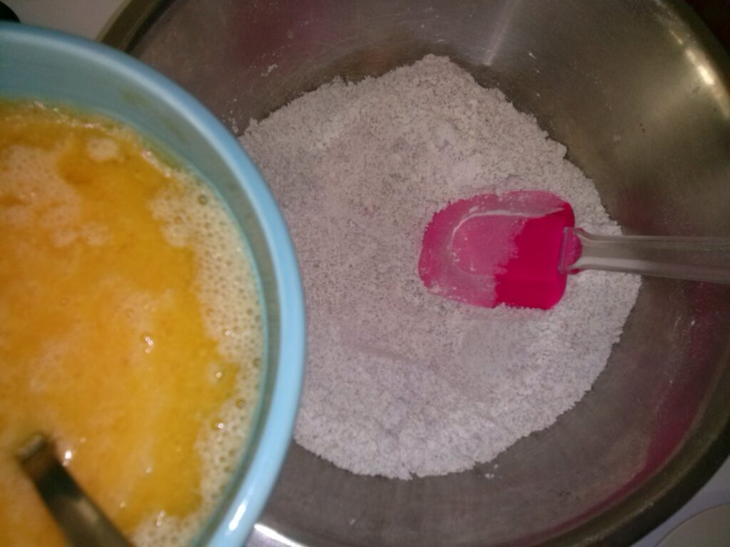 Lo siguiente es mezclar , aras un hoyo en la masa y poco a poco integrando los líquidos en movimientos envolventes y muy suaves, recuerda lo que hablamos al principio……